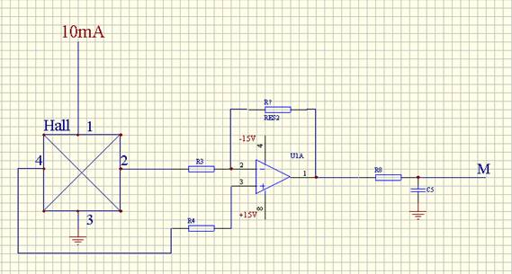 三 .如上圖二是開環(huán)直測型(HKA-P)電量傳感器的工作原理圖, 被測電流產(chǎn)生的磁場使霍耳元件發(fā)生霍耳效應(yīng),霍耳電壓在霍耳元件的2和4端產(chǎn)生,經(jīng)過放大電路后直接輸出電壓(M端),它不存在磁補償.