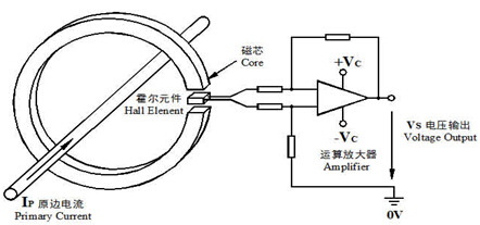 霍爾電流傳感器開環(huán)(直放式)原理:如圖1所示,當(dāng)原邊電流IP流過一根長導(dǎo)線時(shí),在導(dǎo)線周圍將產(chǎn)生磁場,磁場的大小與流過導(dǎo)線的電流成正比,產(chǎn)生的磁場聚集在磁環(huán)內(nèi),通過磁環(huán)氣隙中霍爾元件進(jìn)行測量并放大輸出,其輸出電壓VS精確的反映原邊電流IP。一般的額定輸出標(biāo)定為4V/5V。
